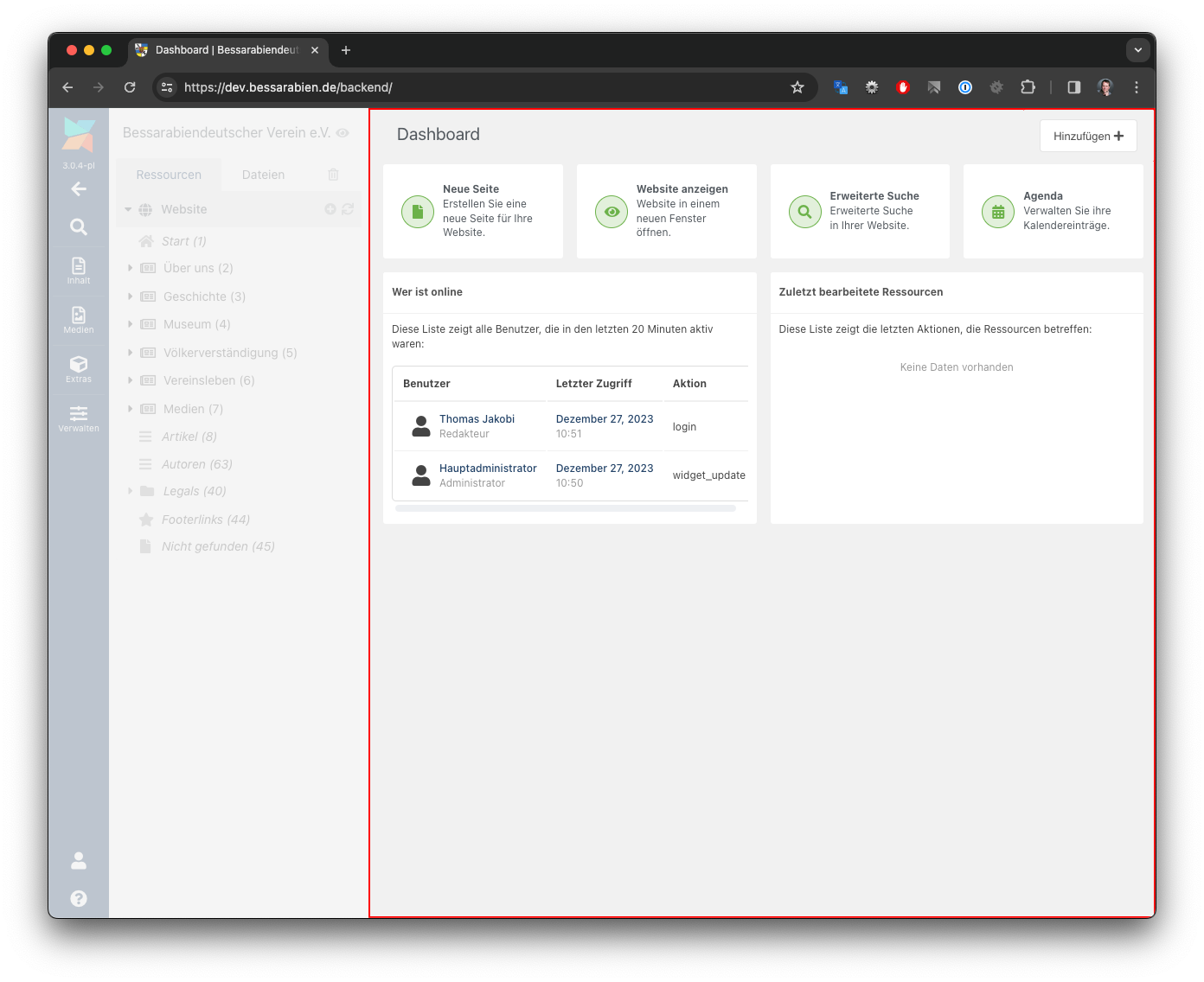 Diese Tabelle zeigt die letzten bearbeiteten Ressourcen. In der Spalte Aktionen lässt sich eine Ressourcen bearbeiten oder ein Überblick der Ressource anzeigen.