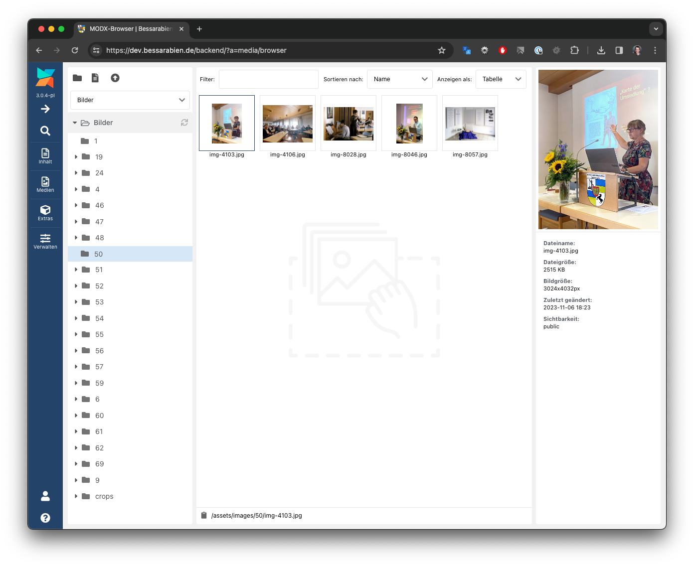 Unter dem Menüpunkt Medien → Medien-Browser können die Bilder und PDF-Dateien der Website verwaltet werden.