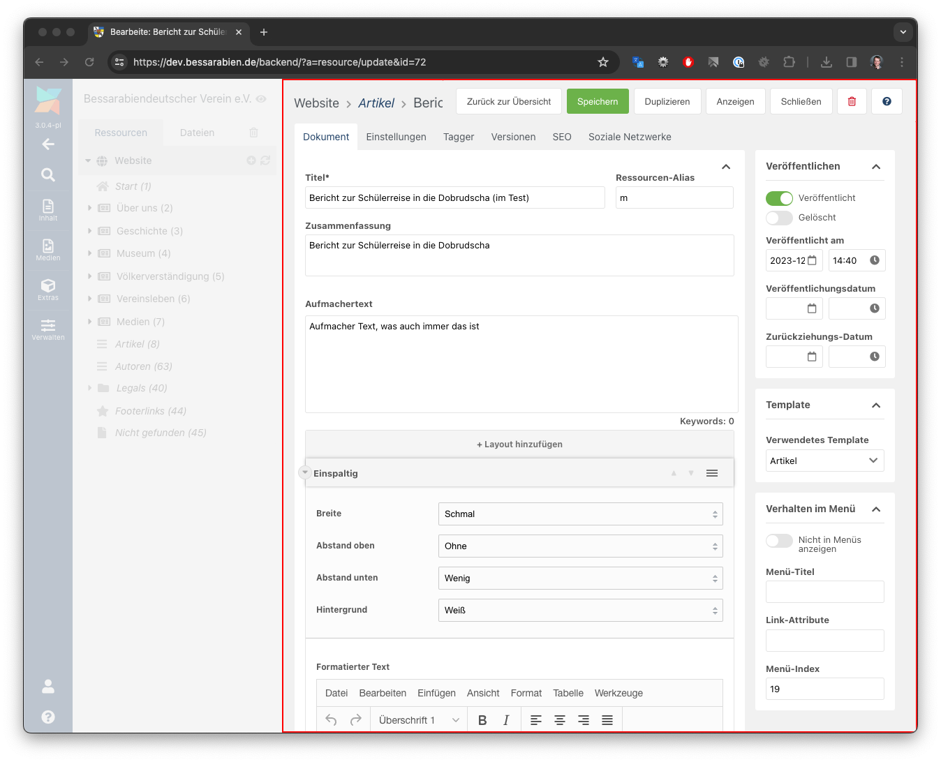 Ein Artikel wird auf der Bessarabien Website in der Artikel Kollektion mit dem Button 'Neuer Artikel' erstellt. In der Tabelle auf dieser Seite sind alle Artikel der Seite gesammelt eingebunden und können von dort auch zum Bearbeiten geöffnet werden.